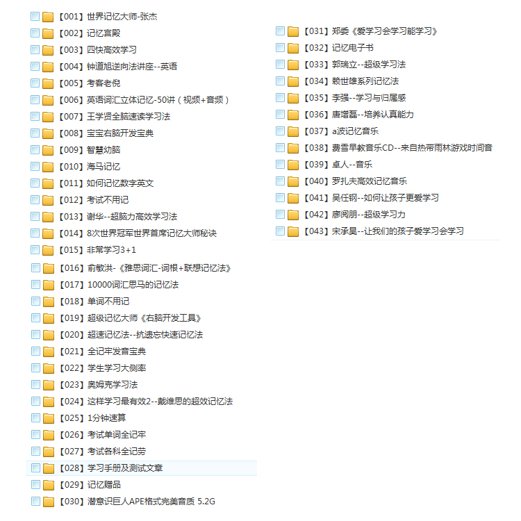 本教程为记忆方法视听教程合集,内含记忆宫殿学习资料及其他记忆力研究方面的老师的资料,以下为宝贝明细。
